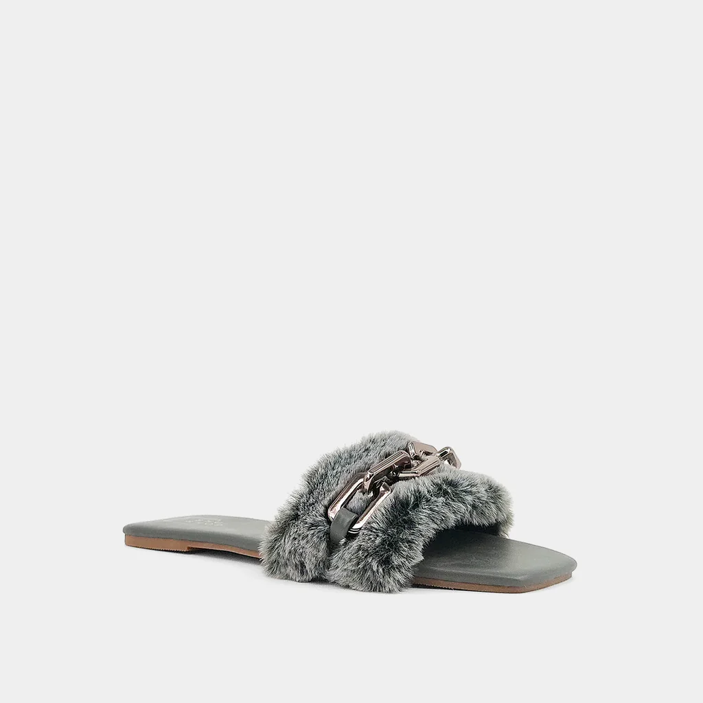 Give your sandals a cozy update with our BERLIN slides. These slip-on sandals feature a plush faux fur upper and metallic chain detail. Wear yours with jeans or short dresses.
