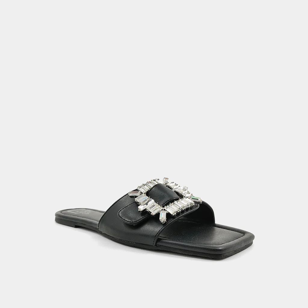 Slip into CONSUELO's easy style with slouchy jeans or breezy dresses. This sandal is crafted from faux leather and is topped with a stunning crystal-embellished buckle.