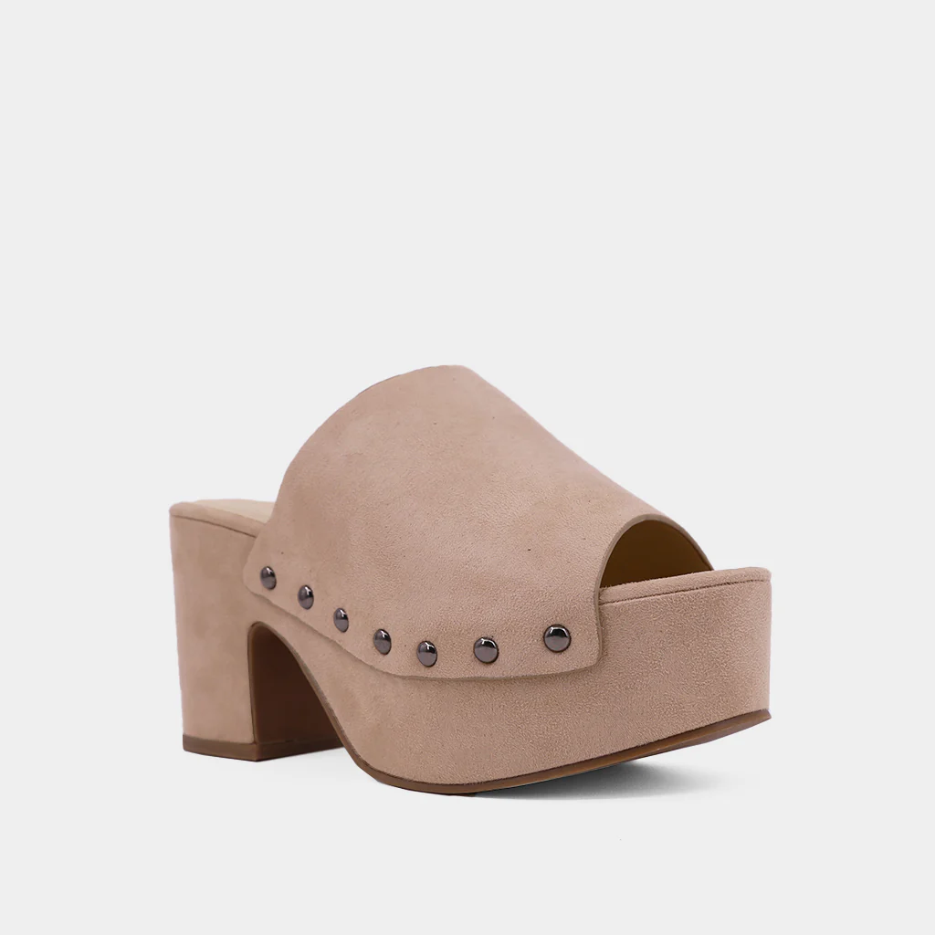 Our GINA wedges are inspired by vintage '70s clogs. This pair is crafted from super soft faux suede and feature metallic studs for some extra shine. Slip them on with everything from cropped jeans to dresses.