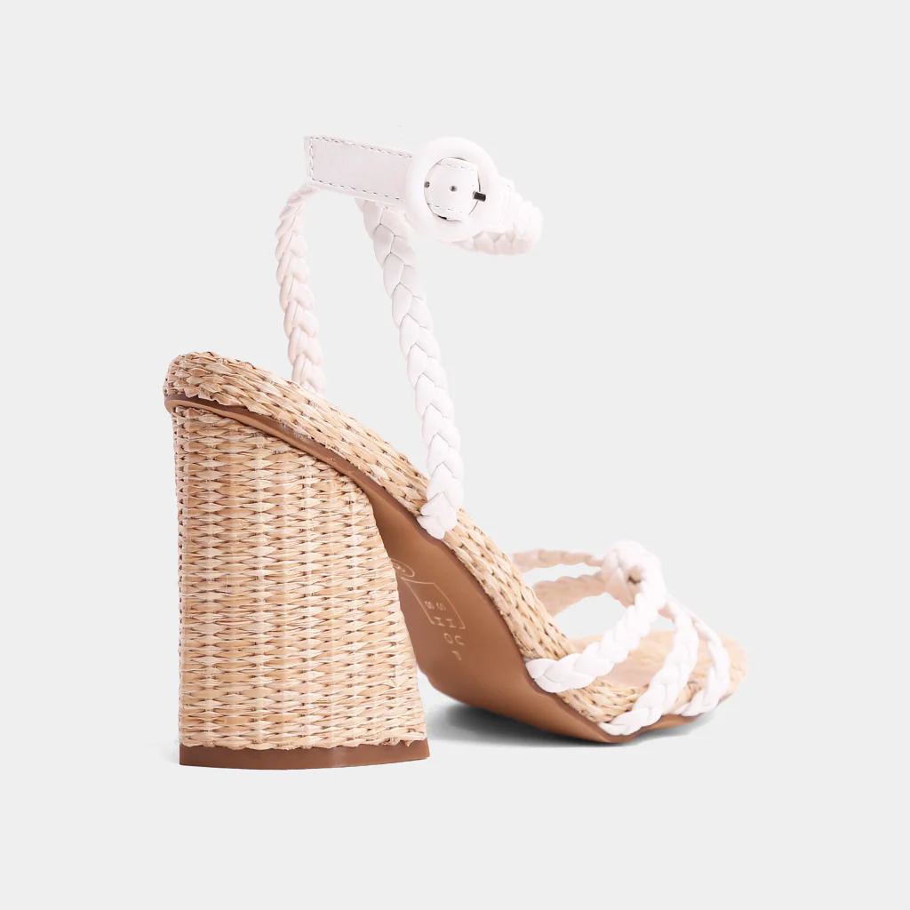 With its braided straps and super fun chunky heel lined in raffia, HELEN is perfect to wear with feminine dresses or a total denim look.