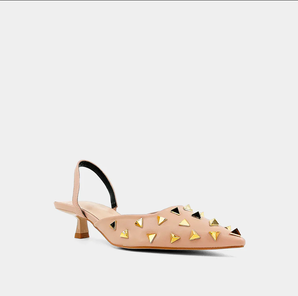 The OCTAVIA pointed closed-toe pumps with elastic slingback straps are made from supple faux leather and showered with golden pyramid studs. The low flared comma heel suits nicely with crisp tailoring.