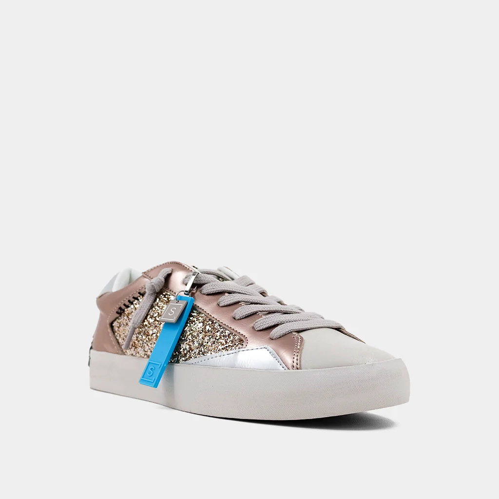 Presenting the RUBY - a sophisticated low-top sneaker meticulously crafted from a fusion of black and glittery suede and premium faux leather. This sneaker showcases flawless stitching details and resilient rubber soles, ensuring enduring comfort and support. Pair these with trousers or a skirt for an effortlessly chic and captivating ensemble. They are accompanied by a contemporary hanging tag highlighting the brand's iconic symbol, adding a touch of style and practicality.