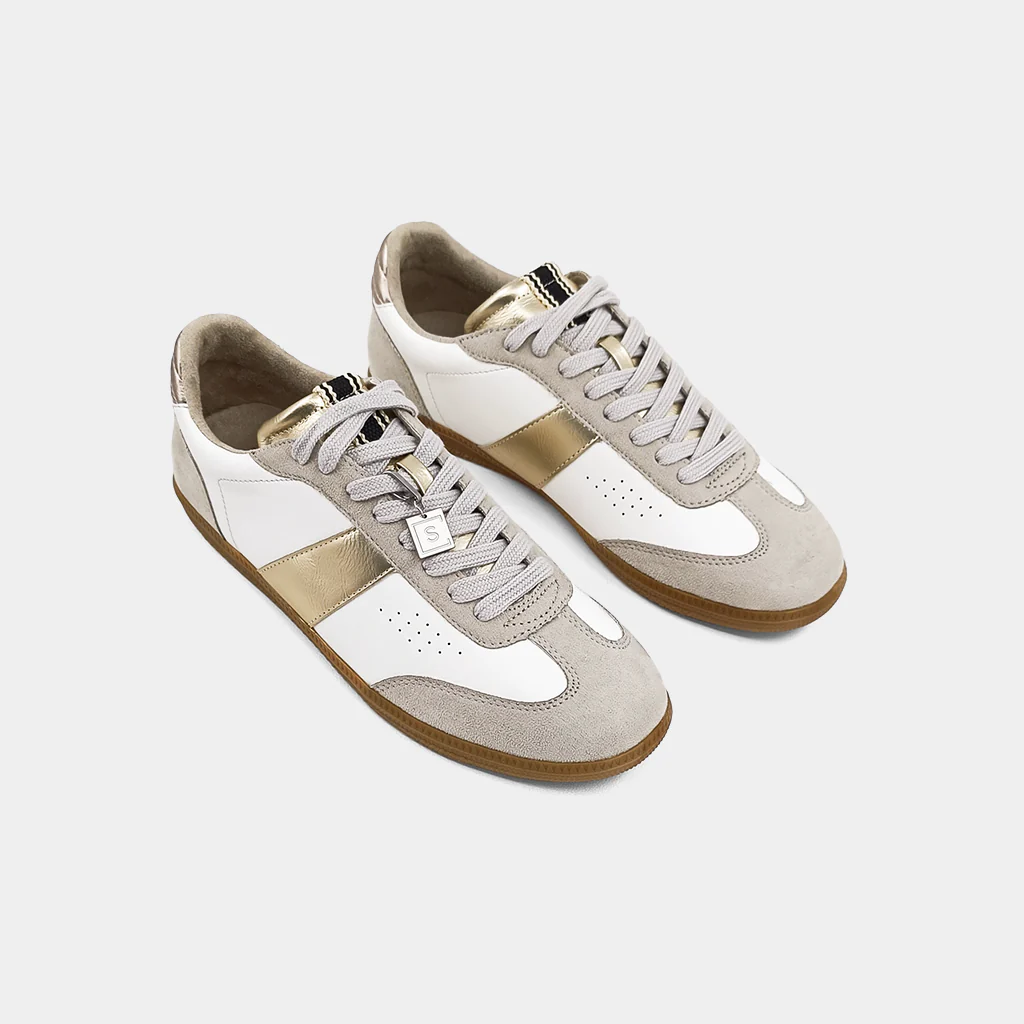 Add a touch of 80s style to your wardrobe with SYDNEY. This new favorite combines vintage and the latest trends, featuring a low-top silhouette crafted with a supple white faux leather body, suede uppers, and metallic faux leather color combinations. The design offers a bold, striking look while maintaining a minimalistic, classic style. The camel-colored rubber soles provide style and comfort, keeping you on-trend all day. A modern pendant tag with the brand icon hangs from the shoe for a fashionable statement or practical use.